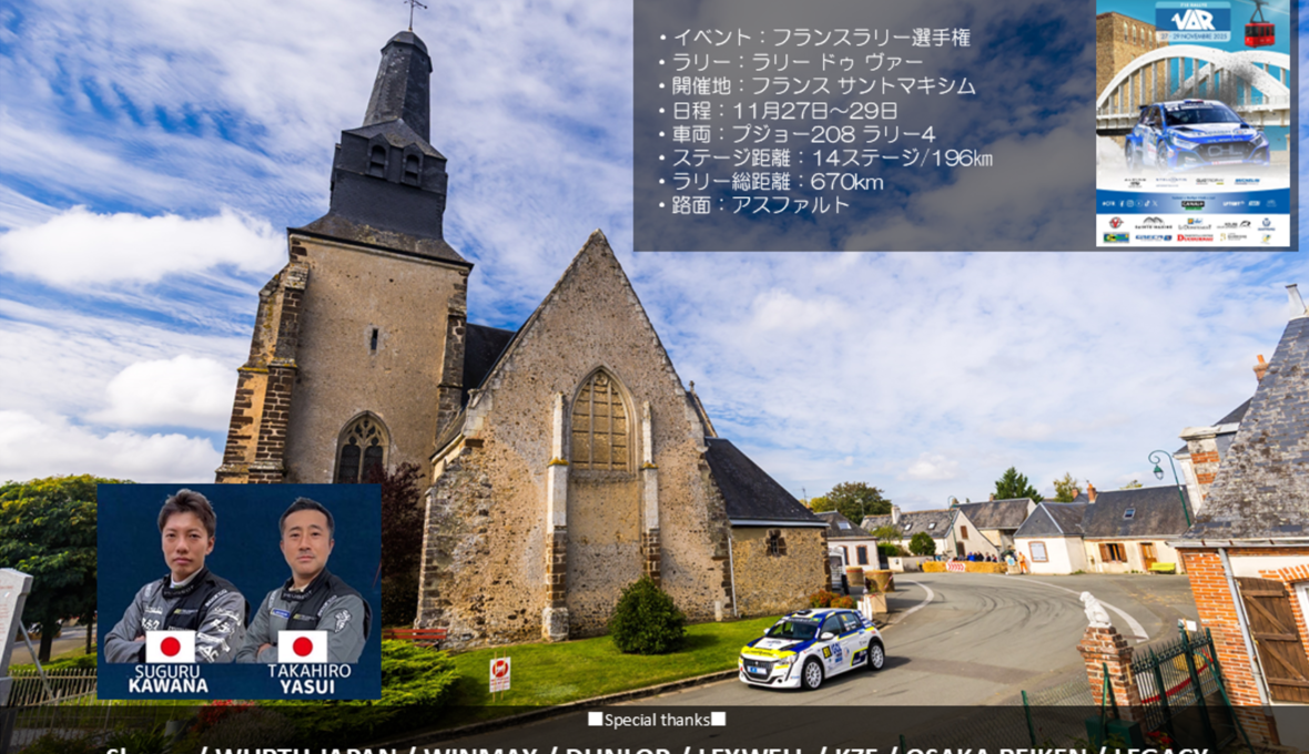 私、川名賢は、11月27日~29日にフランスのサントマキシムをホストタウンに開催されるフランスラリー選手権「Rallye du Var」に参戦致します。コドライバーは保井隆宏選手とコンビを組みます。 今大会も、ダンロップ … 続きを読む 【参戦発表:フランスラリー選手権(Rallye du Var 2025)】